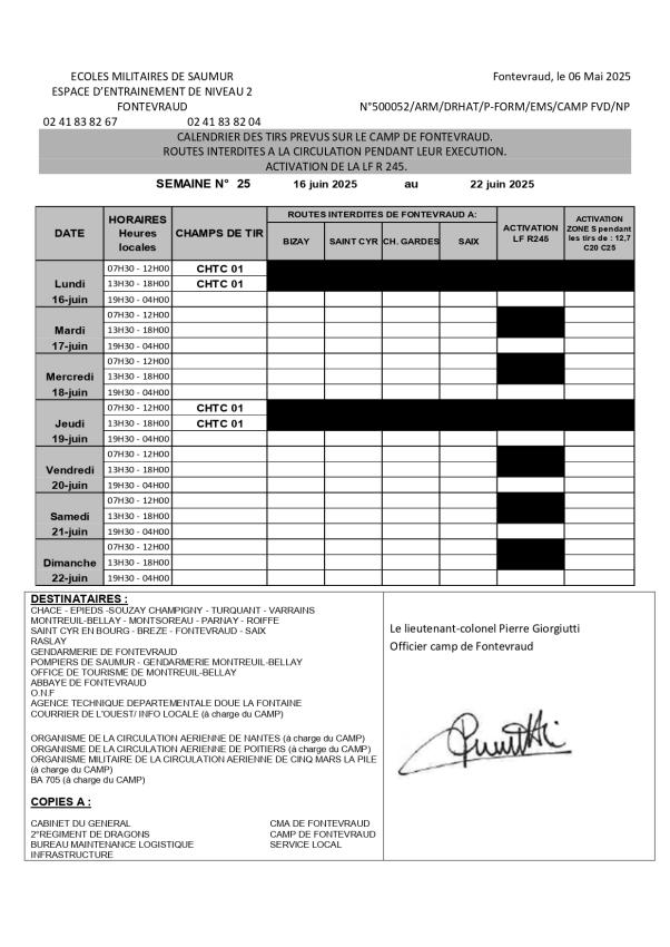 Camp militaire de Fontevraud - Fermetures de routes Publié le 20/10/2025 Les fermetures de routes : Semaine 43 : du 20 au 26 octobre Semaine 44 : Du 27 octobre au 2 novembre Semaine 45 : Du 3 au 9 novembre Semaine 46 : Du 10 au 16 novembre Semaine 47 : Du 17 novembre au 23 novembre Semaine 48 : Du 24 au 30 novembre